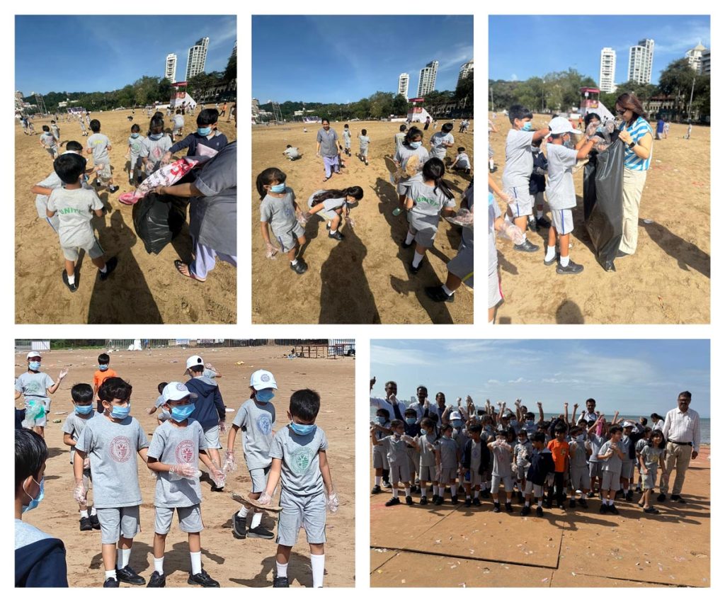 Grade 2 - Beach clean up - Chowpatty. Driven by their learning in the 'Sharing Our Planet' unit, Grade 2 students did a Beach Clean-up at Chowpatty. By observing the detrimental effects of waste first-hand, the students took responsible action to protect the environment. This experience served as a powerful opportunity for them to develop as caring and reflective learners dedicated to promoting sustainability in their community.